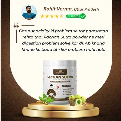 Experience natural relief from digestive issues with Kayashree Pachan Sutra, an Ayurvedic blend designed to support a healthy digestive system. Made with herbs like Nagarmotha, Pushkaramool, Rose Petals, Triphala, Fennel, Alum, and Nishoth, it helps relieve gas, acidity, bloating, and indigestion, keeping you comfortable after meals.