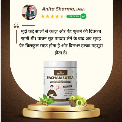 Pachan Sutra Powder is an Ayurvedic herbal blend specially formulated to support healthy digestion, relieve acidity, gas, and bloating naturally.